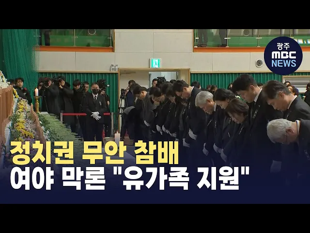 (앵커)안타까운 참사에 여야 정치권은 일제히 사고 현장을 찾았습니다.큰 슬픔에 빠진 유가족을 위로하고 실질적인 지원을 약속하는 데에는여야가 따로 없었습니다.최황지 기자입니다.(기자)제주항공 여객기 참사로 179명의 희생자가 발생하자, 전남도는 모든 자원을 유가족 지원에 쏟겠다고 말했습니다.* 김영록 / 전남도...