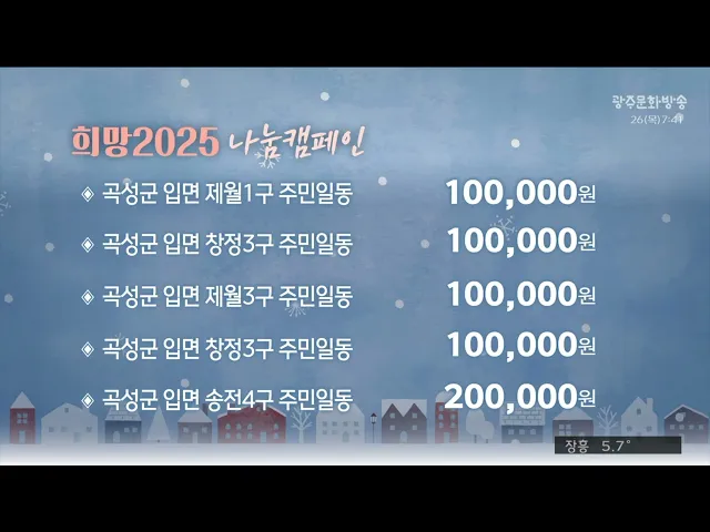 '희망 2025 나눔 캠페인'에 성금을 보내주신 분들입니다.곡성군 곡성읍 생활개선회 회원일동 100,000전남외고 생태봉사단 300,000광주 어룡초등학교 학부모회 200,000나주 도담유치원 159명 및 교육공동체 일동 487,000장성군 동화면 구룡1리 정병수 님 215,000장성군 동화면 월산2리 주민일동 120,000영광군 대마면 송죽2...