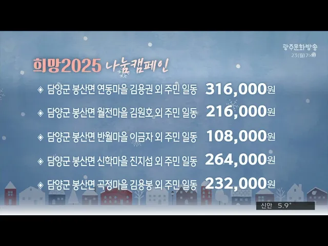 '희망 2025 나눔 캠페인'에 성금을 보내주신 분들입니다.장성군 황룡면 월평1리 주민일동 300,000장성군 황룡면 옥정2리 주민일동 100,000장성군 황룡면 신호1리 주민일동 300,000장성군 황룡면 장산1리 주민일동 200,000나주시 빛가람동 이지더원아파트 주민일동 160,000담양군 봉산면 연동마을 김용권 외 주민일동 316,00...