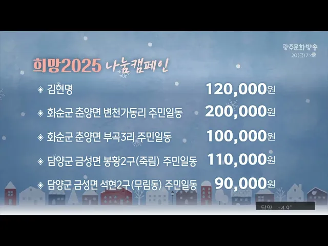 '희망 2025 나눔 캠페인'에 성금을 보내주신 분들입니다.김현명 120,000화순군 춘양면 변천가동리 주민일동 200,000화순군 춘양면 부곡3리 주민일동 100,000담양군 금성면 봉황2구(죽림) 주민일동 110,000담양군 금성면 석현2구(무림동) 주민일동 90,000송정서초등학교 4학년 학생 및 교사 200,000담양군 창평면 유천2리 주...