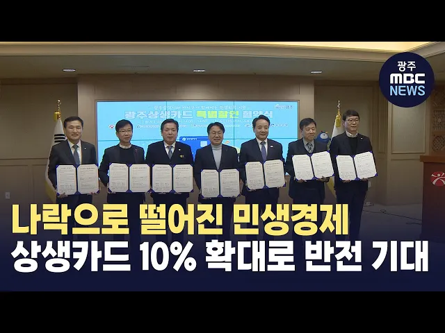 광주시와 5개 자치구가민생 경제 회복을 위해내년 1월 한달 간상생카드 할인율을 확대하기로 했습니다.광주시와 5개 자치구는오늘(18) 협약식을 열고기존 7%였던 상생카드 할인율을10%로 인상하기로 했습니다.1인당 구매한도는 50만원인데,선불카드와 체크카드두 가지 유형을 사용할 수 있습니다.발행규모는 1천억 규모이며...