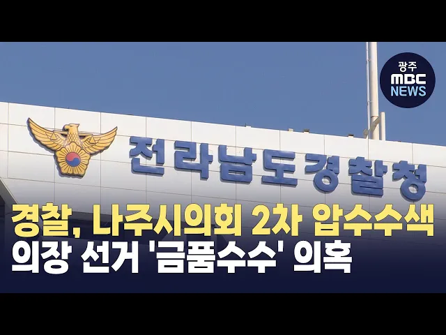 나주시의회 의장단 선출과정에서의 금품 수수 의혹을 수사중인경찰이 오늘(18) 나주 시의원 등에 대한 두번째 압수수색을 벌였습니다.전남경찰청은 뇌물수수*공여 혐의로 입건된 나주시의원의 사무실과 주거지, 차량 등을 압수수색해 추가 증거물 수집에 나섰습니다.경찰은 특정 의장 후보가 동료 의원들에게 1천만원 상당...