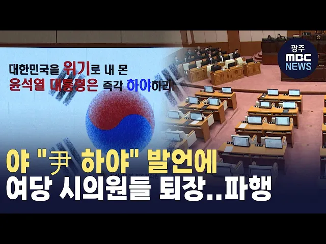 (앵커) 더불어민주당 부산시의원이 대통령 하야를 촉구하는 발언을 하자 국민의힘 의원들이 회의장에서 집단퇴장하며 회의가 중단됐습니다.부산시의회 본회의가 파행을 빚었습니다.부산문화방송 김유나 기자입니다. (기자)부산시의회 정례회 본회의 5분 자유발언.국민의힘 시의원들이 회의장을 우르르 빠져나갑니다.더불어...