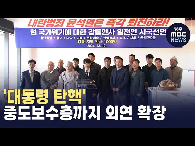 (앵커)강원권에서도 대통령 탄핵과 국민의힘 권성동 의원의 탄핵 투표 참여를 촉구하는 성명이 이어졌습니다.특히 진보 야당은 물론강릉지역 중도보수층에서도 성명을 발표해외연이 확장되고 있습니다.MBC강원영동 김인성 기자가 보도합니다.(기자)'내란범죄 윤석열은 즉각 퇴진하라'는 내용의 플래카드가 걸렸습니다.강릉...