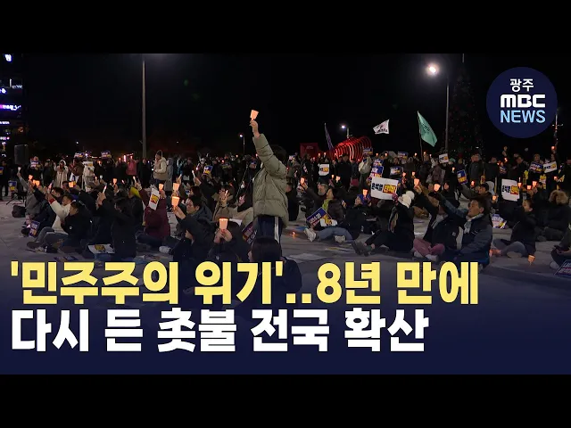 (앵커)박근혜 전 대통령 탄핵 이후 시민들이 8년 만에 또다시 거리로 나서고 있습니다.전남 서부지역에서 민주주의 위기를 바라만 볼 수 없다며추운 겨울, 촛불을 든 시민 행렬은 확산하고 있습니다.김규희 기자가 보도합니다.(기자)"윤석열을 탄핵하라. 윤석열을 체포하라."한밤중 난데없는 기습 계엄령의 후폭풍은시민들...