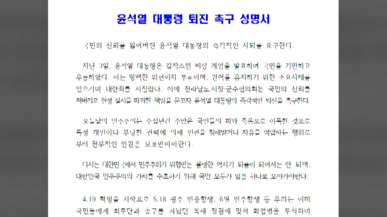 전남시장군수협의회가 국민의 신뢰를 잃어버리고 헌정 질서를 파괴한 윤석열 대통령의 퇴진을 촉구했습니다.전남시장군수협의회는 수많은 국민들의 피와 죽음으로 이룩한 오늘날의 민주주의는 특정 개인이나 부당한 권력에 의해 인권을 침해받거나자유를 억압하는 행위로부터 보호받아야한다며민주주의가 위협받는 불행한 ...