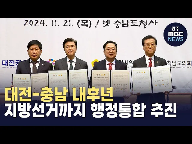 (앵커)대구경북이 내년 출범을 목표로행정통합을 선언하자 다른 권역에서너도나도 행정통합을 하겠다고 선언하고 있습니다.부산울산경남에 이어 오늘(21)대전과 충남이 내후년 7월 출범을 목표로행정통합을 추진하겠다고 선언했습니다.광주와 전남은 '공항'문제에 막혀논의도 하지 못하고 있는 현실과 대비됩니다.대전문화...