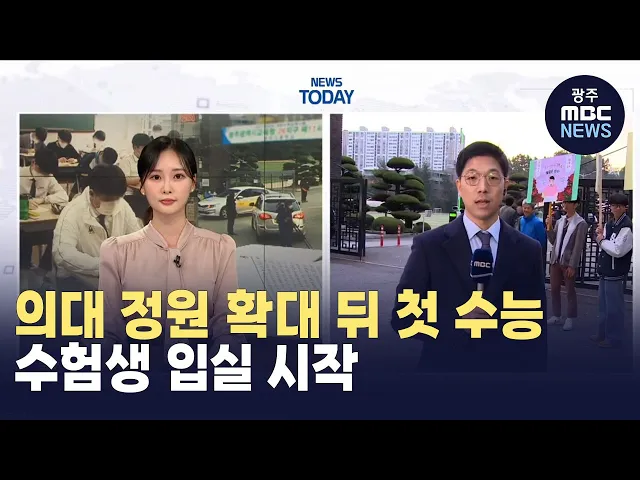 (앵커)2025학년도 대학수학능력시험이 곧 시작됩니다.의대 모집 정원이 대폭 늘어난 뒤 치러지는 첫 수능이기도 한데요.고사장에 나가있는 취재기자 연결하겠습니다.천홍희 기자,현장 분위기가 어떻습니까!(기자)네 수능이 치러지는 이곳 광덕고 앞은 선배들을 응원하는 후배들로가득 찼습니다.시험 시간이 가까워지면서 수...