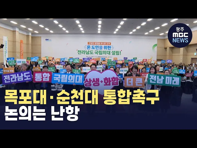 (앵커)김영록 전남지사가 어제(12일) 오는 15일까지 목포대와 순천대의 신속한 통합결정을 촉구하고 나섰습니다.여야의정협의체에서 전남의대신설이 의제로 논의돼야 한다며 이같이 촉구했지만 양 대학의 통합논의는 난항을 겪고 있습니다.김 윤 기자가 보도합니다.(기자)김영록 전남지사의 목포대와 순천대의 신속한 통합...