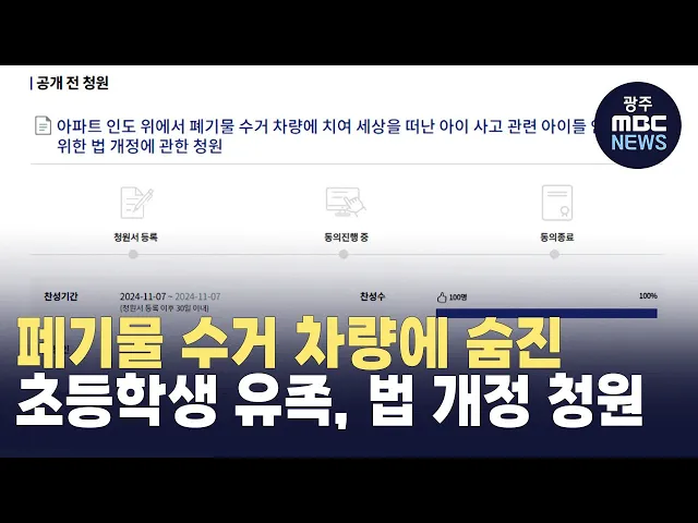 아파트 폐기물 수거차량에 치여 숨진 초등학생의 유가족이 국회 국민동의청원 홈페이지에 글을 올려 철저한 조사와 법 개정을 촉구했습니다.자신을 피해자의 가족이라고 밝힌 청원인 김 모 씨는 "아파트 단지 안에서 사고가 나도 도로교통법상 도로에 난 사고에 준하는 처벌을 받을 수 있도록 법을 개정해달라"고 밝혔습니...