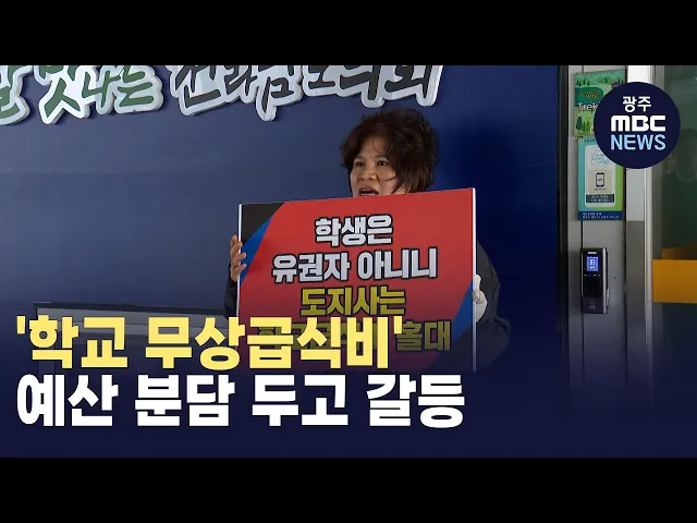 (앵커)내년도 전남의 학교 무상급식비를어떻게 분담할 것인지를 두고전라남도와 전남교육청의 갈등이 커지고 있습니다.좀처럼 합의점을 찾지 못하면서학교 현장의 속도 타들어가고 있습니다.안준호 기자가 취재했습니다.(기자)전라남도가 학교 급식비의 지원을 홀대한다는 내용의 피켓이 내걸렸습니다.내년도 무상급식 식품...