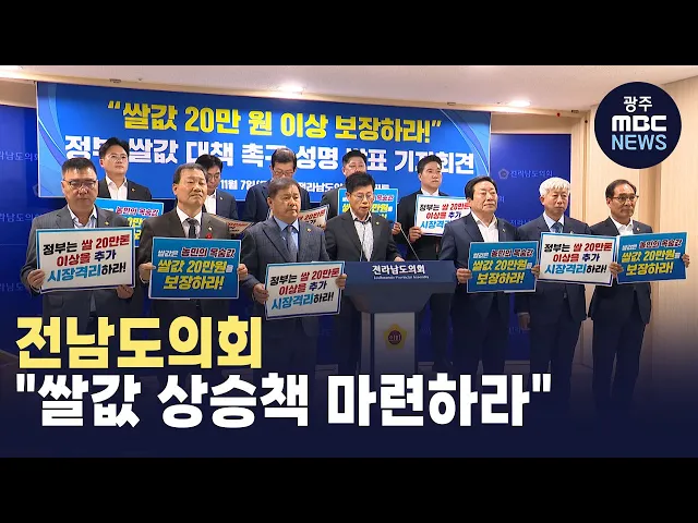 전남도의회는 오늘(7일) 정부의 수확기 쌀값대책들이 쌀값 상승에 전혀 영향을 주지 못하고 있다며실효적인 대책마련을 촉구했습니다.도의회는 정부가 지난 10월 올해쌀 20만 톤 사전격리를 발표했지만 실효적인 효과를 거두지 못했다며추가 20만 톤 이상 시장격리와 재고쌀 격리 등을 포함한 대책을 통해수확기 20만 원 이...