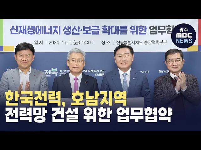 한국전력이 전력망 확충을 위해 지난 9월 광주시, 전남도와 업무 협약을 맺은 데 이어, 전북도와도 협력하기로 했습니다.한국전력은 송전 시설 입지 선정, 인허가 등의 절차가 지연되지 않도록 지자체와 협력하는 업무 협약을 전북도와도 맺고 전력망을 적기에 건설하겠다고 밝혔습니다.오는 2031년까지 호남 지역에서 생산...