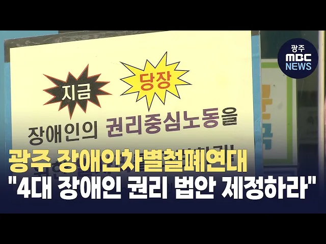 광주 장애인차별철폐연대는 어제(4) 기자회견을 열고 4대 장애인 권리 법안의 연내 통과를 촉구했습니다.단체는 "윤석열 정부 들어 장애인의 자립 생활 권리가 총체적으로 후퇴하고 있다"며 "장애인은 시설에 격리되어야만 하는 무능한 존재가 아니며, 장애인 권리 법안은 인간으로서 누려야 하는 보통의 삶을 위한 것이다"...