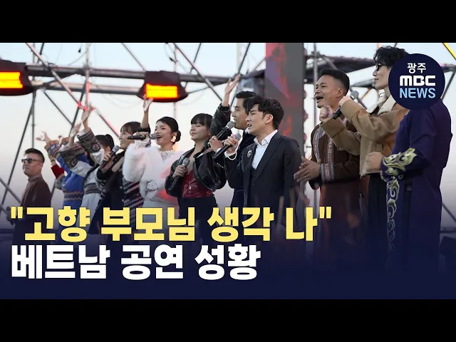 (앵커)베트남 이주민을 위한 위문공연이 어제(2) 목포에서 열렸는데요.베트남 정상급 가수들이 선보인 뜨겁고 감동적인 무대에 이주민을 포함한 관객 모두가 큰 호응을 보냈습니다.김규희 기자가 보도합니다.(기자)베트남 국민 가수로 불리는 쾅 하가 목포에 떴습니다.경쾌한 리듬의 노래가 울려 퍼지자, 관객석에서 환호성...