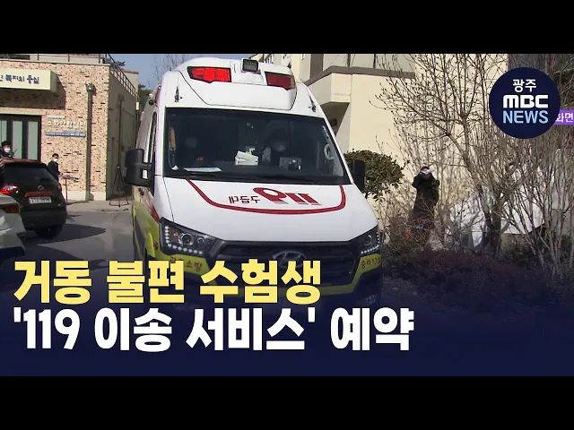 광주시소방안전본부는 오는 14일로 예정된 수능시험일에거동이 불편한 수험생들의 편의를 위해119 이송 서비스를 제공한다고 밝혔습니다.‘119 이송 서비스’는 장애나 부상 등으로 거동이 불편한 수험생들을 시험장까지 데려다주는 서비스로이용을 원하는 수험생이나 학부모는119나 가까운 소방서에 수능 전날까지 전화로 예...