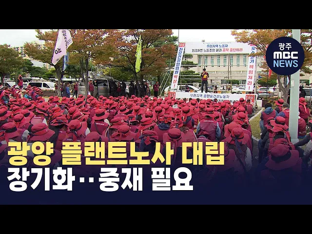(앵커)광양제철산단 공사 현장에서일하는 플랜트건설 노동자와 사측이7개월째 대립하고 있습니다.노조가 노조원을 징계하고이를 사측에 보고하라는 조항을 두고양측이 입장 차를 좁히지 못하고 있습니다.유민호 기자입니다.(기자)서울 포스코센터 본관.광양 플랜트건설노조가건물 진입을 시도합니다.직원과 몸싸움이 벌어지...