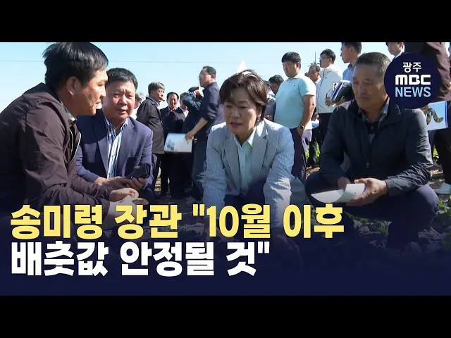 송미령 농림축산식품부 장관은 오늘(29일) 배추 주산지인 해남군 화원면을 방문하고, 가을배추 생육 상황을 점검했습니다.송 장관은배추 재배농가와 농협 관계자의의견을 청취하고, "김장철 배추는 지금 배추 가격과는 관련이 없다"며"가을, 겨울 배추는 심은지 얼마 되지 않았고, 10월 이후 가격이 안정될 것"이라고 말했...