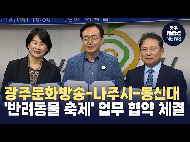광주문화방송은 오늘(12) 오후 나주시청에서 나주시, 동신대학교와 업무협약을 체결하고 반려동물 축제 행사에서 협력을 도모하기로 했습니다.협약을 통해 광주문화방송은 축제 홍보를, 나주시와 동신대학교는 각각 프로그램 예산과 인력 등을 제공해 협력하기로 했습니다.#광주MBC #나주시 #동신대 #반려동물축제