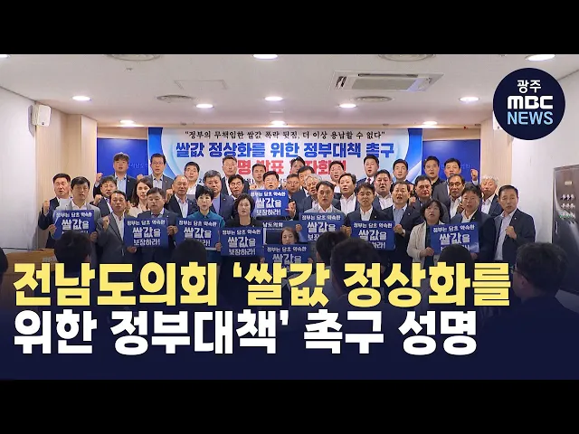 전라남도의회는 오늘(12일)도의회 브리핑룸에서 기자회견을 갖고 쌀값 폭락 사태와 관련해 정부의 무책임한 대응을 규탄하고 빠른 근본대책 마련을 촉구하는 성명서를 발표했습니다.이들은 성명서를 통해 정부의 지난해 매입물량 축소라는 정책실패와지난 10일 발표한 쌀값 대책부실을 질타하며 정부의 추가적인 재고쌀 시...