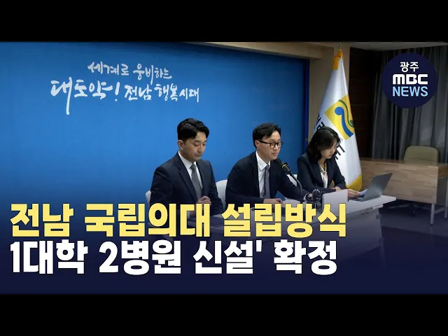 전남 국립 의과대학 설립 방식이1개 대학 2개 병원 신설로 확정됐습니다.전남 국립의대 신설 정부추천 용역 주관사는오늘(12) 전남도청에서 기자회견을 열고6차례의 도민 공청회와 여론조사 등을 통해설립방식선정위원회에서 1대학 2병원 신설계획을 결정했다고 밝혔습니다.또 일부에서 제안한 '공동 의대' 방식에 대해서는...