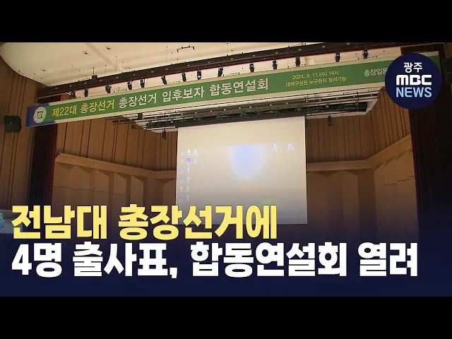 전남대학교 22대 총장선거가 합동연설회를 시작으로 본격적인 막을 올렸습니다.오늘(11일) 전남대학교 민주마루에서 열린 합동연설회에서는 22대 총장선거에 출사표를 던진 송진규, 김재국, 이근배, 한은미 후보가 대학 발전 방향 등을 설명하며 지지를 당부했습니다.4명의 후보자들은 내일(12일)부터 인문대와 이공대 등을...