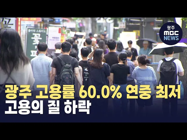 광주의 고용률이 연중 최저치로 떨어졌습니다.통계청이 발표한 8월 고용동향에 따르면광주의 고용률은 60.0%로올들어 가장 낮았고,1년 전보다도 0.2%포인트 하락했습니다.특히 경기 불황의 영향을 받고 있는 음식숙박업과 도소매업에서는취업자 수가 1년 전보다 5% 줄었고,건설업 분야에서도 5.6% 감소했습니다.또 임금 근...