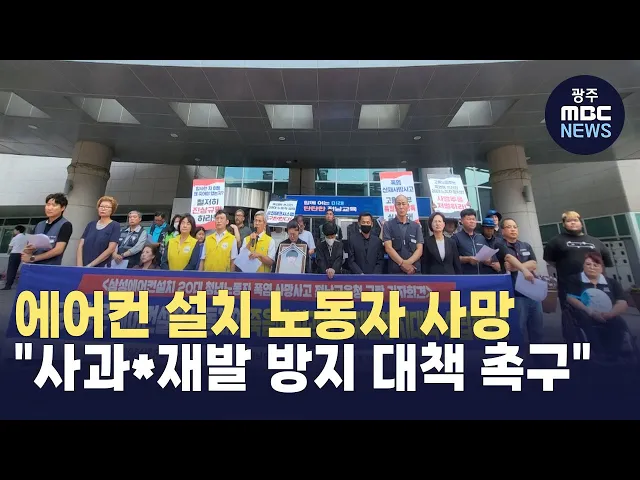장성의 한 중학교 급식실에서에어컨을 설치하다가 온열질환으로 숨진 20대 노동자의 유족 등이해당 사업 발주처인 전남교육청을 찾아사과와 재발 방지 대책을 촉구했습니다.'삼성에어컨 설치기사 청년노동자 폭염 사망사고 대책회의'는 오늘(9) 전남도교육청 앞에서 기자회견을 열고"사업 발주처인 교육청도 안전관리보건계...