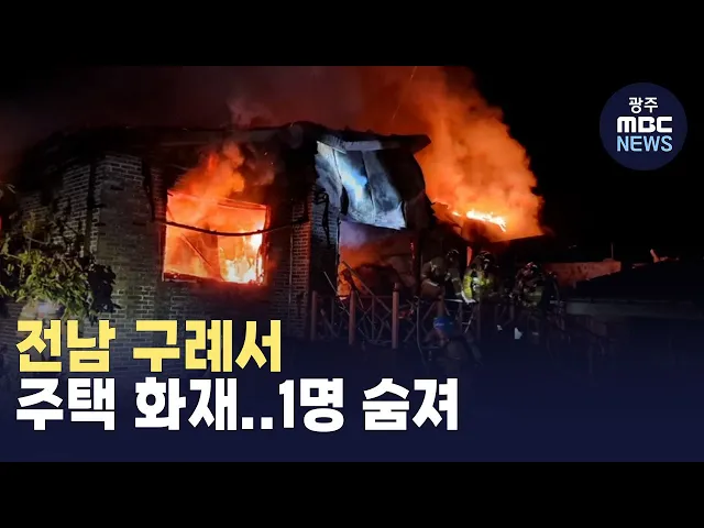 오늘 새벽 4시 10분쯤 전남 구례군 광의면의 한 주택에서 불이 나1명이 숨졌습니다.불은 주택을 모두 태우고 1시간 여만에 진화됐습니다.소방당국은 주택에 90대 노부부가 거주하고 있던 것으로 보인다며, 다른 1명의 소재도 확인 중이라고 밝혔습니다.#구례#화재