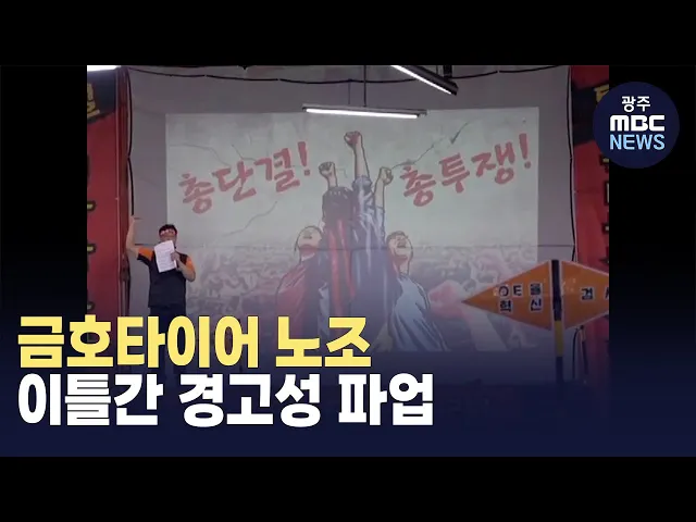 금호타이어 노조가 6년 만에 총파업을 결정하고 오늘부터(28) 이틀간 경고성 파업에 들어갔습니다.전국금속노조 광주전남지부 금호타이어 노조는 오늘(28)부터 내일까지 하루 4시간 경고성 파업을 한 뒤, 협상이 진행되지 않으면 다음달(9) 3일 총파업을 하겠다고 밝혔습니다.노조는 "사측과 교섭을 진행했지만 기본급 인상...