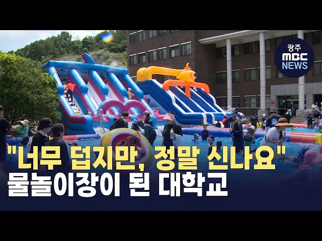 (앵커)폭염에는 누가 뭐래도 물놀이가 최고죠.하지만 더운 날씨에 교외로 가려면 가기 전에 지쳐버리기 마련입니다.그래서 동네 물놀이 시설이 인기인데, 지역 대학도 캠퍼스 문을 활짝 열었습니다.주현정기자가 다녀왔습니다.(기자)대학 캠퍼스가 거대한 물놀이장으로 변신했습니다.말 그대로 물 반, 사람 반입니다.물미끄...