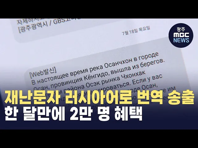 (앵커)갑작스러운 기후 변화나 사고가 있을 때,이 소식을 빠르게 알리고 대응하도록 돕는 수단이 재난문자인데요.많은 외국인들이 한국어를 이해하지 못해,안전에서 소외되고 있다는 비판이꾸준히 제기돼 왔습니다.이렇다 할 대책이 나오지 않자,광주의 한 민간 방송사가 나서서러시아로 된 재난문자를 작성해보내고 있습니...