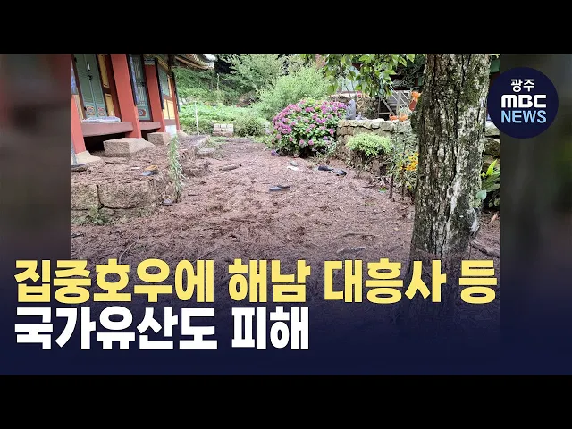 전남 지역에 쏟아진 집중 호우에국가유산 피해도 잇따랐습니다.국가유산청은 그제(16) 전남에 내린 비로 인해해남 지역의 국가유산 2건의피해가 확인됐다고 밝혔습니다.해남 두륜산 대흥사와 달마산 미황사에서는토사와 석축이 일부 유실되고 전기 배관이 노출되는 피해가 발생했으며,국가유산청은 다행히 사찰이나 불상 등...
