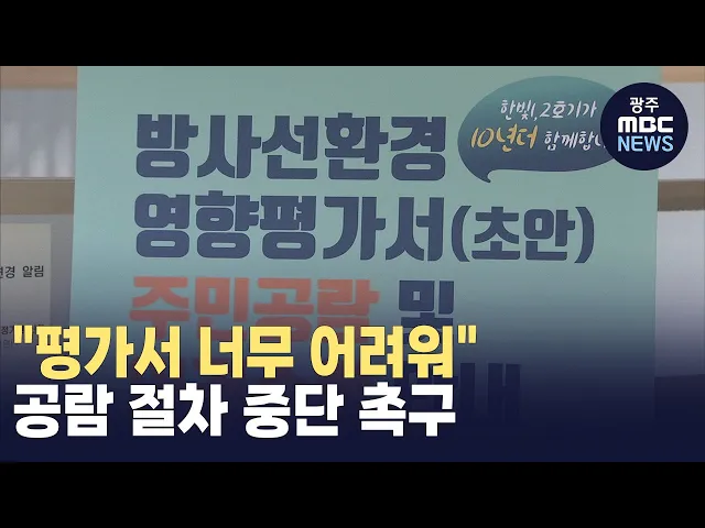 광주 전남 환경단체가 한빛원전 1,2호기 수명연장을 위한 절차인방사선환경영향평가서의 공람 중단을 촉구했습니다.한빛핵발전소대응 호남권공동행동은오늘(1) 오전 기자회견을 열고 전문용어가 나열돼 있는 평가서 초안을 주민들은 무슨 내용인지도 모른 채 서명했다는 이야기가 들리고 있다며공람을 중단해야 한다고 강조...