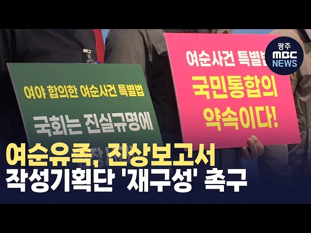 여순사건 진상조사 보고서 작성기획단의 편향성 논란과 관련해 유족들이 상경 기자회견에 나섰습니다. 여순항쟁 전국유족총연합 회원들과지역 국회의원 등은 오늘(10) 국회와 여순사건중앙위원회 앞에서 잇따라 기자회견을 열고진상조사보고서 작성기획단을 편향된 비전문가들로 구성한 것은 국민과 국회를 무시하는 처사라...