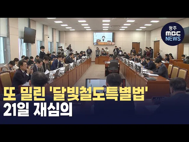 헌정 사상 가장 많은 여야 국회의원이 공동발의해 빠른 추진이 기대됐던 '달빛철도 건설 사업'의 국회 법안 심의가 또 다시 미뤄졌습니다. 국회 교통법안심사소위는 오늘(19) 달빛철도 특별법 제정안을 재논의했지만 결론을 내지 못하고 다음 회의가 열리는 오는 21일로 안건을 넘겼습니다.