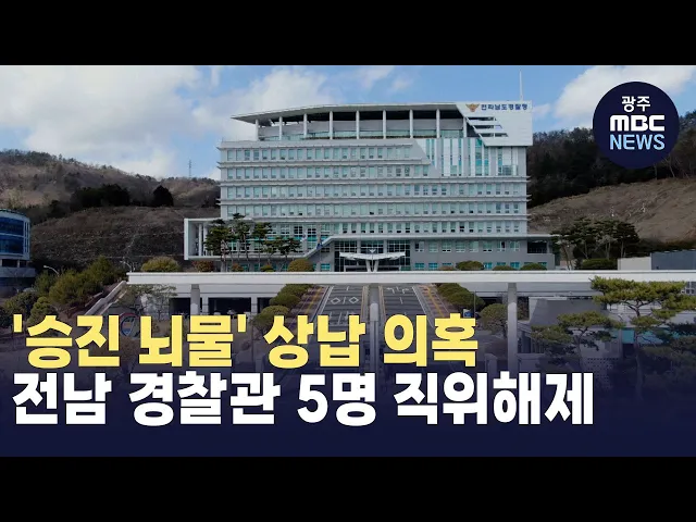 전남지방경찰청은 뇌물을 상납하고 승진한 의혹을 받는 소속 경찰관 5명을 직위해제했다고 밝혔습니다.전남경찰은 '사건 브로커' 62살 성 모씨를 구속기소한 광주지검 반부패강력수사부로부터 최근 압수수색을 당한 경정 2명과 경감 3명 등 현직 간부 5명이 검찰에 피의자로 입건됨에 따라 이같이 조치했습니다.이들은 모두...