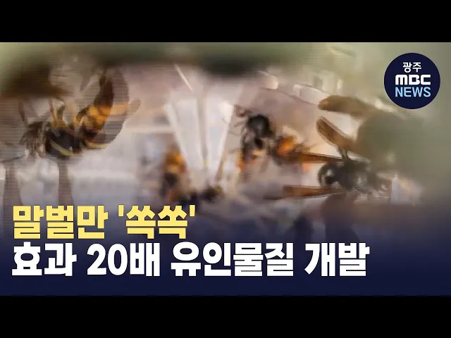 (앵커)말벌은 꿀벌을 잡아먹어 최근 발생한 꿀벌 실종 사태의 원인 중 하나로 꼽히는데요, 충남농업기술원이 말벌 유인 효과가 기존 제품보다 20배가량 높은 물질을 개발했습니다.대전문화방송 김태욱 기자입니다.(기자)나무에 거꾸로 매달린 말벌이 꿀벌 한 마리를 먹어 치웁니다.크기가 5cm에 달하는 장수말벌은 10마리가...