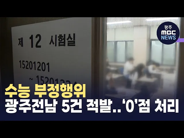 2024학년도 대학수학능력시험이 종료된 가운데 수능 부정행위와 관련해 광주 4명, 전남 1명 등 모두 5명이 적발돼 '0'점 처리될 것으로 보입니다. 부정행위를 유형별로 보면 전남은 전자시계 미제출이, 광주에서는 휴대전화 미제출과 종료 종 이후 답안지 작성 등입니다. 교육당국은 "부정행위로 적발된 수험생은 고의성 여...