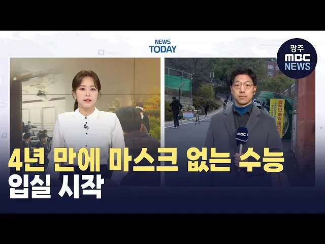 먼저 오늘의 주요뉴스입니다.------------2024 대학수학능력시험이 잠시 후 시작합니다. 올해 광주는 1만 6천 명이 전남은 1만 3천여 명이 응시합니다.----------------------광주 민간공항과 군공항의 무안으로 동시이전을 확실히 약속해달라는 전라남도의 요구에 대해 전라남도가 광주 군공항이 이전이 우선 확정돼야 한...