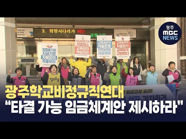 급식조리사 등으로 구성된 광주지역학교비정규직연대회의가 임금 체계 개편안 등과 관련해 타결 가능한 교섭안을 제시하라고 사측에 요구했습니다.광주지역학교비정규직연대회의는 어제(15) 광주시교육청 앞에서 기자회견을 열고"교육부 등 사측이 기본급 5만 원 인상 외에 모든 임금 항목을 동결하겠다는 안을 고수하고 있...