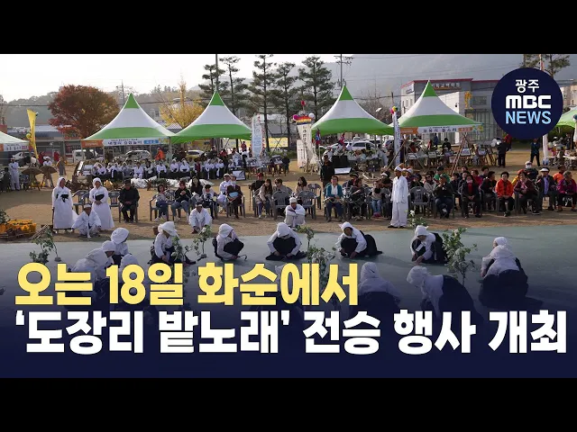 전라남도 무형문화재 제51호 도장리 밭노래 전승 행사가 오는 18일(토) 화순군 도암면 도장리 일대에서 열립니다.도장리 밭노래는 옛날 여인들이 밭일을 하며 부르던 노동요로,마을 주민들이 15년 전 민속보존회를 만들고, 이를 축제로 확대했습니다. 행사는 한천농악단의 골목 길놀이로 시작해,난타와 밭노래 공연, 합창 ...