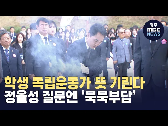 (앵커) 정율성 사업과 관련해 연일 반대 발언을 이어온 박민식 국가보훈부 장관이 광주를 찾았습니다.제94주년 학생독립운동 기념식에참석하기 위해서였는데요.기념식에 참석한 이후 보훈단체 회원과 함께정율성 흉상과 생가도 방문했습니다.천홍희 기잡니다.(기자)제94주년 학생독립운동 기념식이 광주에서 열렸습니다.'타...