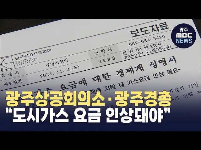 광주 경제계가 도시가스 요금 인상을 요구하고 나섰습니다. 광주상공회의소는 오늘 입장문을 내고 "당장의 부담을 피하기 위해 불가피한 요금 인상을 미룬다면 더 큰 규모의 부메랑으로 돌아올 수 있다"며 광주시의 인상 결정을 촉구했습니다.광주경영자총협회도 성명을 통해 "광주가 도시가스 요금이 5년 이상 동결되고 있...