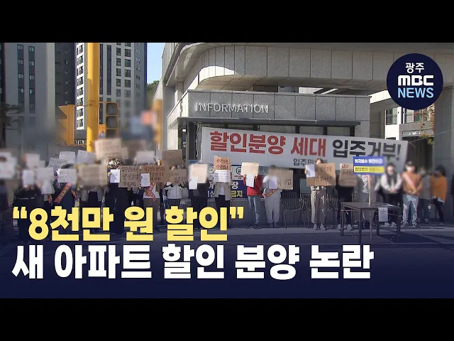 (앵커)광양의 한 새 아파트가 떠들썩합니다.최근 건설사가 미분양 세대를 최대 8천만 원까지 할인해 분양하면서 기존 입주민들의 반발이 거세지고 있습니다.보도에 김단비 기자입니다.(기자)올 초 입주를 시작한 광양 마동의 한 아파트 입구입니다.수십 명의 입주민들이 손 피켓을 들고 시위를 벌이고 있습니다.스케치북에...