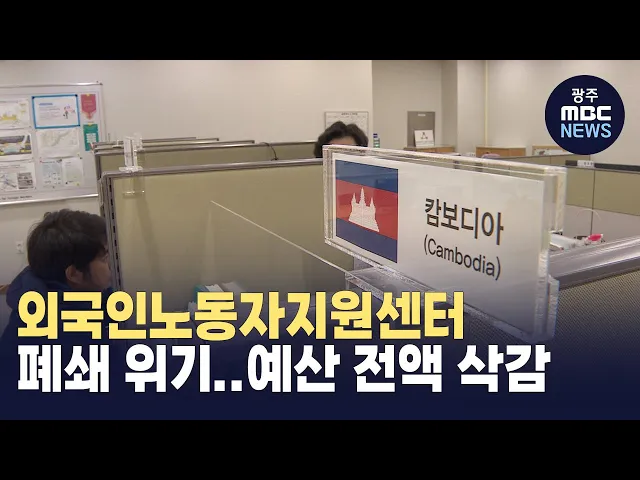 (앵커)외국인 노동자들의 정착과 일자리 등을 도와주는 지원센터가 있는데 내년에 폐쇄될 위기에 처해 있습니다.정부가 내년도 예산을 전액삭감했기 때문인데여러가지 부작용이 우려됩니다.천홍희 기자가 취재했습니다.(기자)광주의 한 꽃재배 농장입니다.여기서 일하는 캄보디아 노동자의 어려움을 듣기 위해 캄보디아에서...