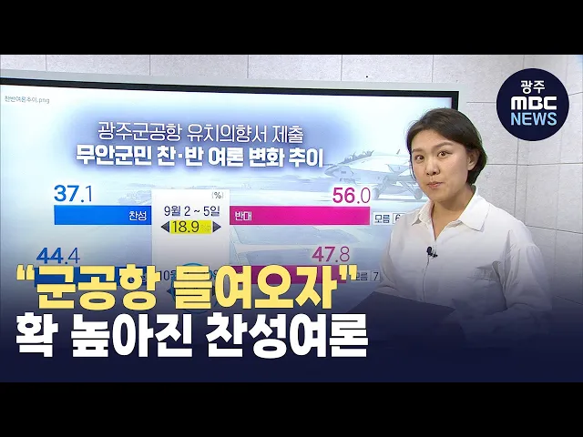 (앵커)광주연구원이 광주군공항 이전과 관련해무안군민과 함평군민들을 상대로 여론조사를 매달 하고 있는데최근 눈에 띄는 변화가 나타났습니다.오차범위 내이긴 하지만 함평군은 군공항 찬성 여론이 반대보다 높았고무안군도 찬성여론이 이전보다 크게 높아졌습니다.주현정기자가 전해드립니다. (기자)광주연구원은 매달...