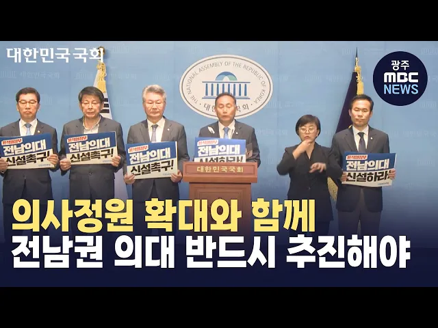 전남이 지역구인 더불어민주당 국회의원들은 오늘(17) 국회에서 공동기자회견을 열고 의사정원 확대와 함께 의대 없는 전남권의 국립의대 신설을 촉구했습니다.의원들은 전남의 의료현실은 붕괴 직전에 이르렀다며지역완결적 의료체계 구축은 의대정원 증원과 함께 의대 없는 전남권 의대 신설과 지역의사제 등을 동시에 추...