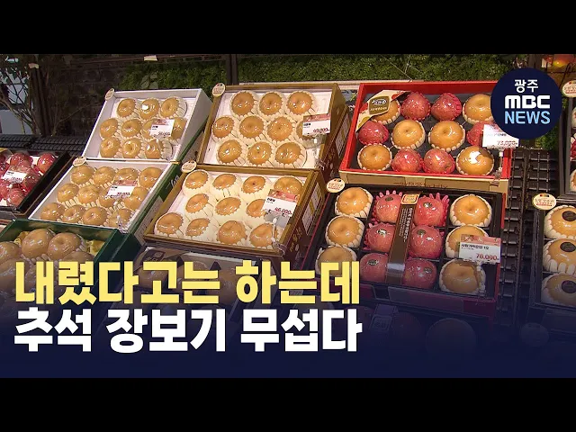 (앵커)추석을 앞두고 정부는 성수품 가격이 내렸다고 발표했습니다. 하지만 추석 장을 보는 소비자들은 올라도 너무 올랐다고 말합니다. 왜 이렇게 차이가 날까요 부정석 기자가 취재했습니다. (기자)창원의 한 대형마틉니다. 매장 입구부터 추석 제수용 과일이 진열돼 있지만 소비자들은 선뜻 사지 못합니다. 가격이 올라...