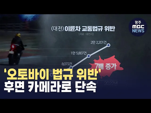 (앵커)번호판이 뒤에만 달려 있는 오토바이는 신호 위반 등 법규를 위반해도 무인 단속 카메라로는 단속이 어려웠는데요, 이제는 오토바이의 난폭 운전도, 단속 카메라만 지나 속도를 내는 얌체 운전도 잡아낼 수 있습니다. 대전에도 후면 단속카메라가 2곳 설치됐습니다. 박선진 기자입니다. (기자) 점심시간대 대전의 한 ...